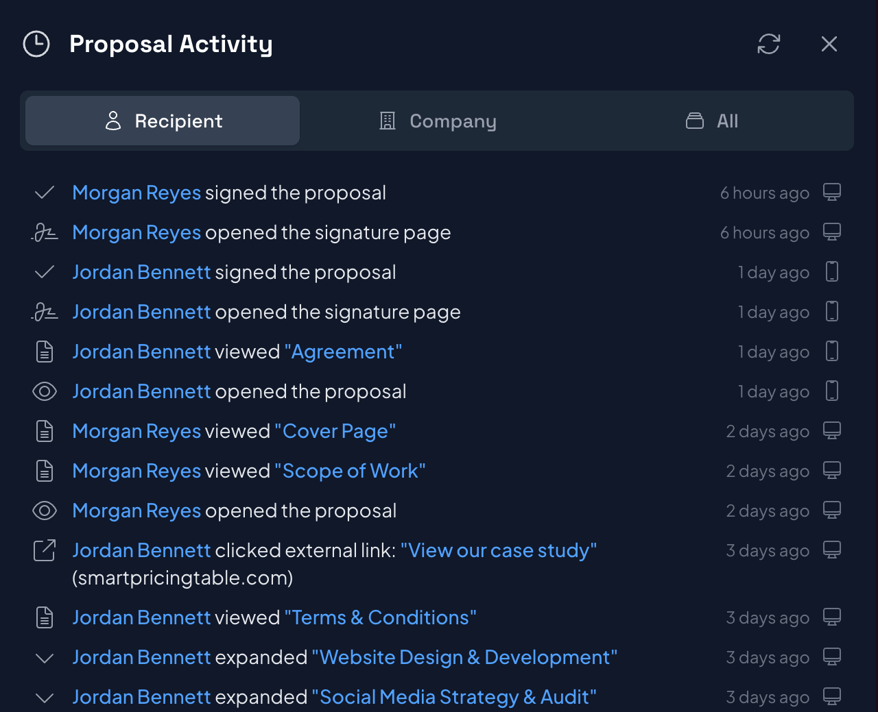 Send and track your proposals with Smart Pricing Table. See recipient analytics, clicks, views, and more.